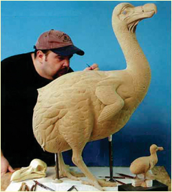 After additional consultations with the dodo experts and the curators in Singapore, George made final adjustments to the basic forms and began to carve the details. Each feather was carefully inscribed in the clay by hand. Once this labor-intensive work was complete, the head, wings and legs were attached to the body of the dodo. A mold was taken from the clay sculpture, and was used to create an epoxy cast.
