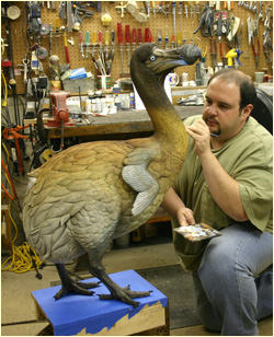 Wildlife Preservations worked in collaboration with Phil Fraley Productions to create a dodo model for the Raffles Museum of Biodiversity Research in Singapore. The nine week process began with a trip to the American Museum of Natural History, in New York City, where the artists of Wildlife Preservations took measurements and photos of dodo bones from the collections of the Ornithology Department. The museum generously provided casts of a dodo skull and of the famous dried dodo head from Oxford University Museum of Natural History.