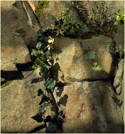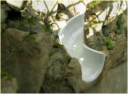 The magnificent indoor pool room of a private client in Newport, CT, features 1,400 square feet of hand-crafted fractured granite, lichens, and lush foliage. The display, which was designed and completed in just six weeks by a small team, features a faux rock staircase, a hidden storage room behind hollow walls, a hot tub, and a long water slide that winds through the surroundings and down to a large swimming pool. A cleverly designed railing runs along the length of the stairs, disguised as a meandering tree branch.