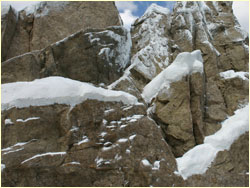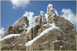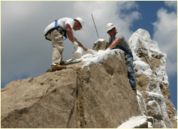 Landry’s T-REX Café commissioned Createk Stone to create the replica of Cerro Torres for their restaurant. Createk, in turn, hired Wildlife Preservations to apply artificial snow to the mountain peaks. The irregular shape and enormity of this structure made for a challenging situation; the pinnacle is forty feet above the roof of the restaurant, and the surfaces are quite steep. George Dante and his team used scaffolding, ladders and climbing harnesses to apply small batches of artificial snow to every peak and crevice of the restaurant’s replica of Cerro Torres. Although Central Florida has a more agreeable climate than the icy mountaintops of Patagonia, the intense sunlight and the occasional hurricane can cause a lot of damage. The artificial snow looks soft and fluffy, but in order to help it survive the climate, it is washable, resistant to ultraviolet light, and can withstand sustained winds over 155 mph.