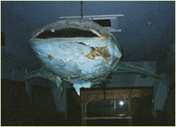The taxidermists who first mounted the whale shark did an admirable job, especially given the massive size of the animal and the very poor preservation of the skin, but time and the elements have not been kind to the whale shark. The Diorama Hall has no climate control or ventilation, so the whale shark was subjected to high temperatures in the summer and low temperatures in the winter. In 1996, the antiquated plumbing in the museum began to leak, causing water to drip on the shark. The water damage caused huge sections of skin to peel away from the whale shark’s armature like limp wallpaper.